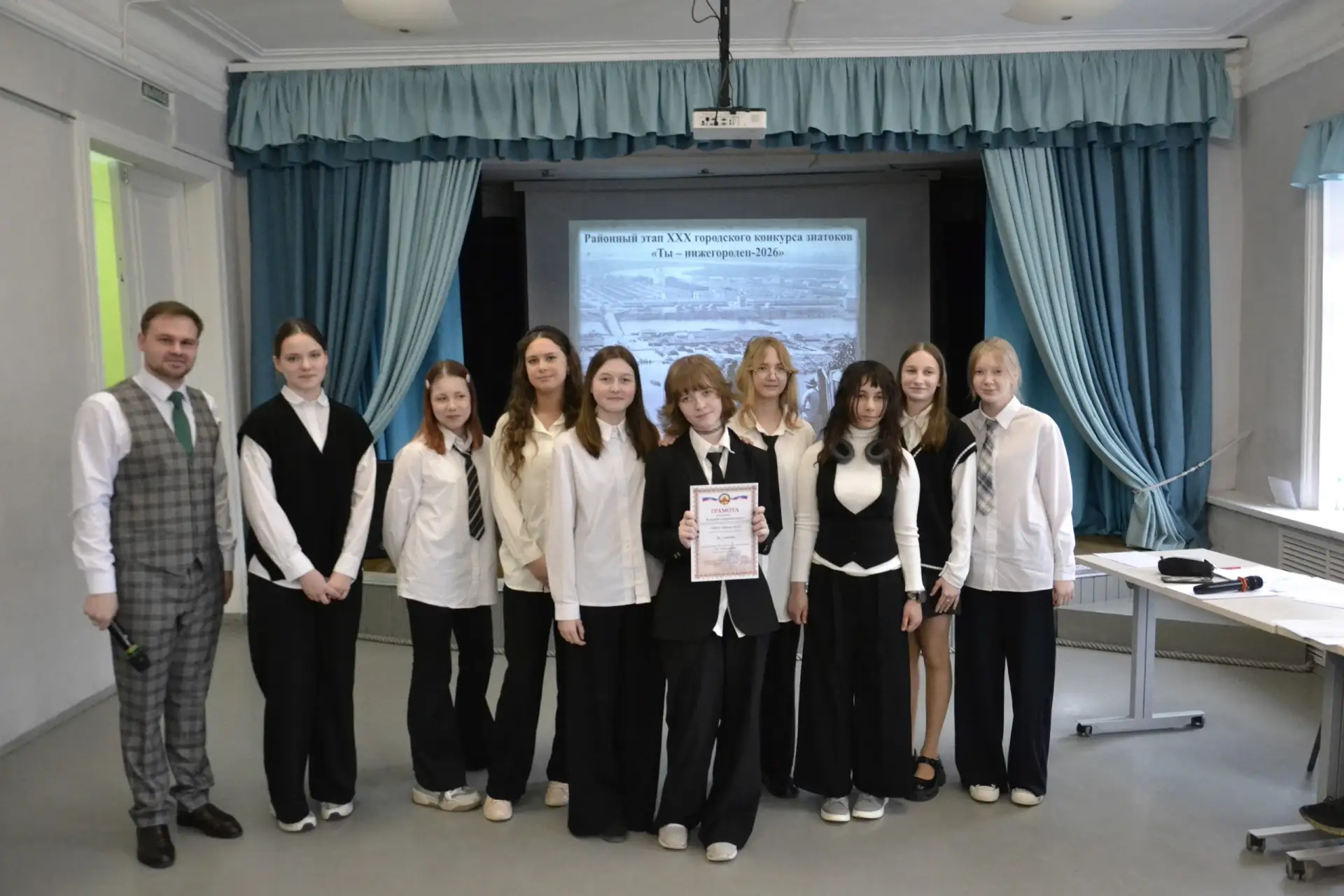 2 апреля 2026 года команда музея нашей школы приняла участие в районном этапе городского конкурса знатоков «Ты — нижегородец». Мероприятие было посвящено сразу двум важным датам: 805-летию Нижнего Новгорода и 130-летию Всероссийской промышленной и художественной выставки 1896 года.